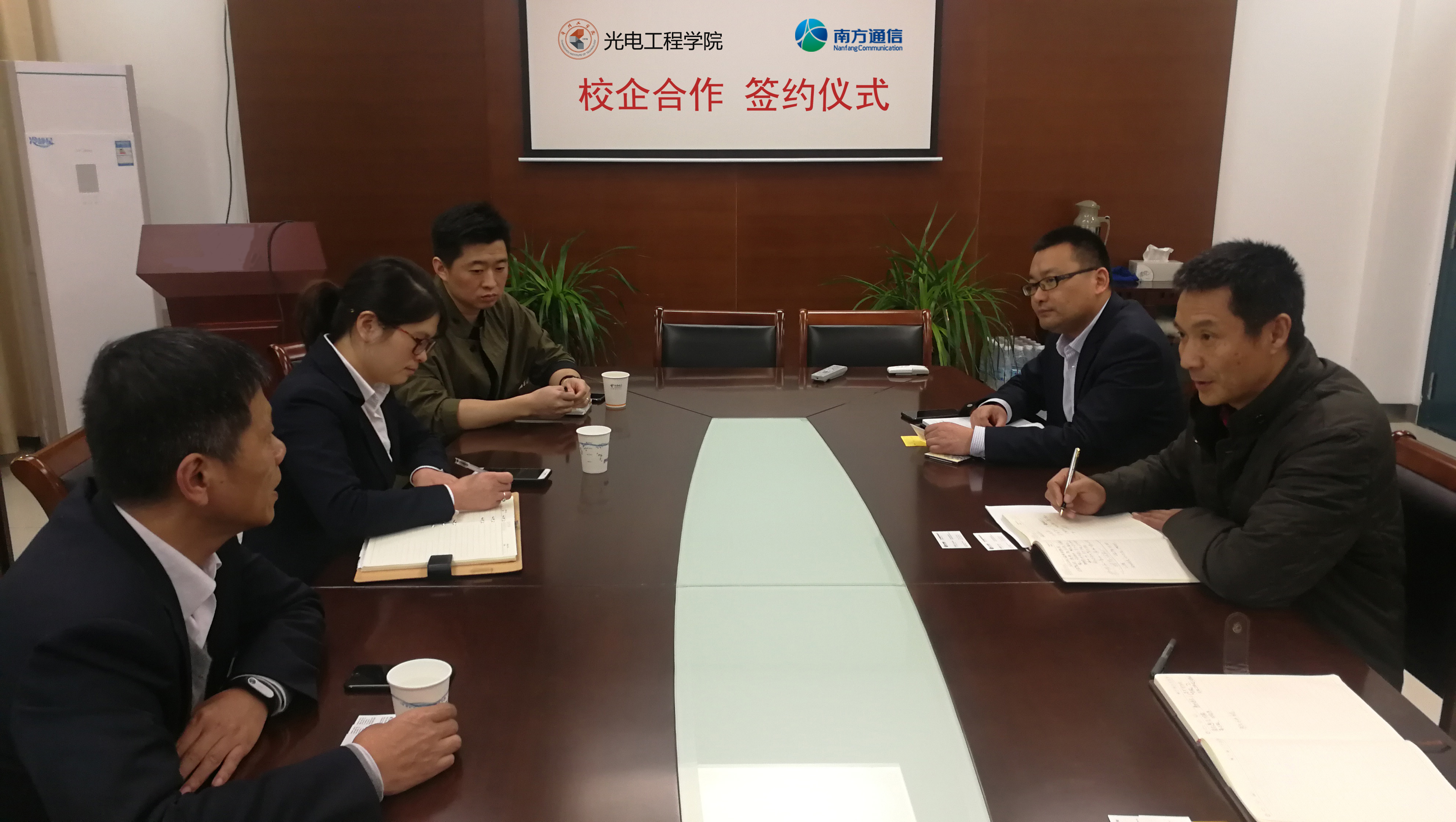 光电工程学院党委书记蒋渭忠介绍了学院的内设机构、师资队伍、学科专业建设等情况。院长潘雪涛希望双方本着共创共赢原则,发挥各自优势,从产品技术创新、学生实习就业、校企合作培训等方面打造长期稳固的合作关系。双方还就光纤通讯产品创新、智慧城市、5G建设与应用等进行了广泛交流,并签订产学研合作协议。