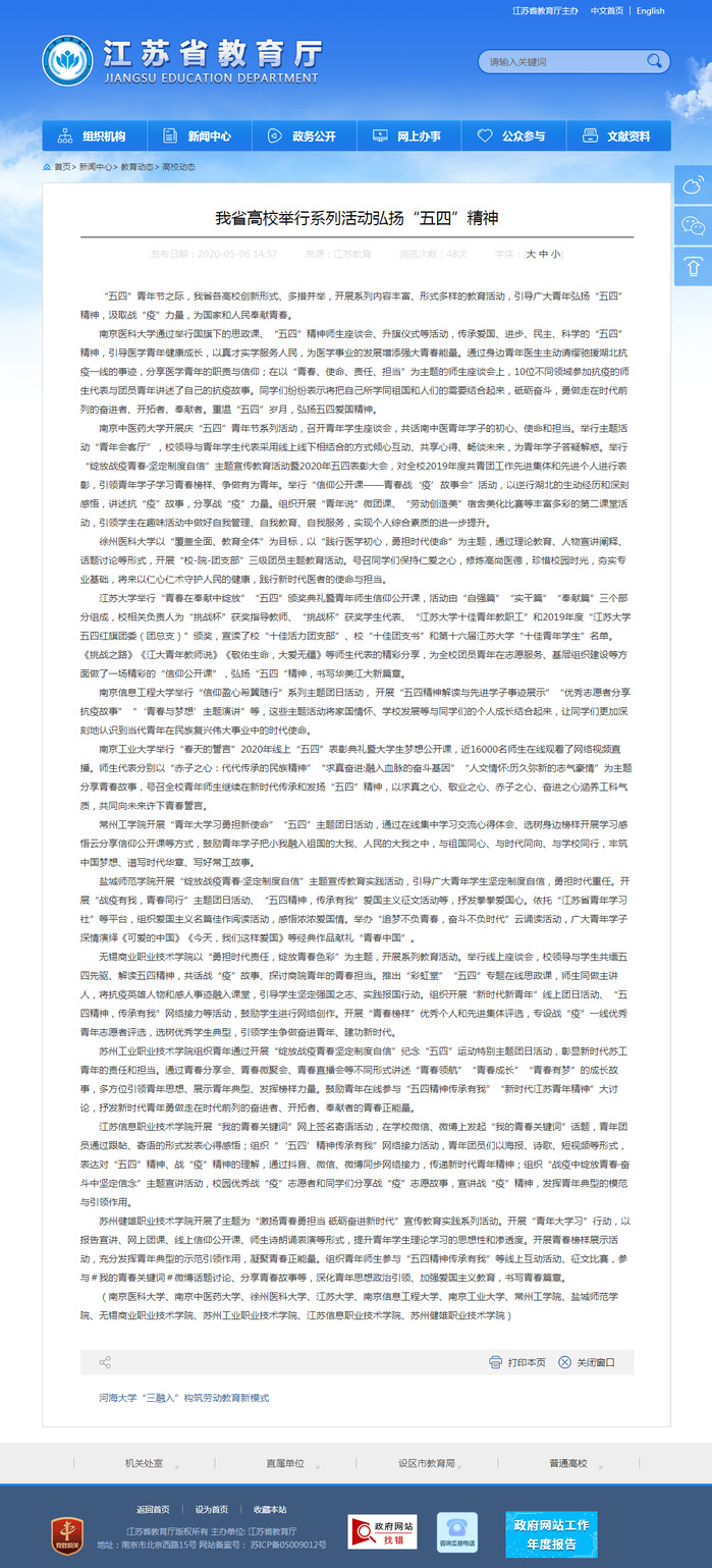 “五四”青年节之际,我省各高校创新形式、多措并举,开展系列内容丰富、形式多样的教育活动,引导广大青年弘扬“五四”精神,汲取战“疫”力量,为国家和人民奉献青春。