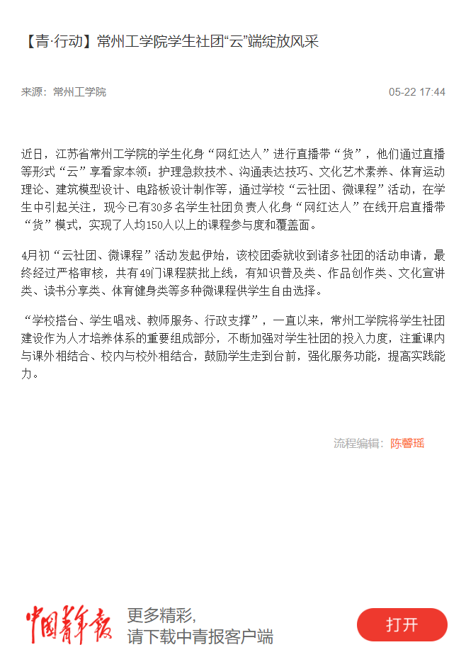 4月初“云社团、微课程”活动发起伊始,该校团委就收到诸多社团的活动申请,最终经过严格审核,共有49门课程获批上线,有知识普及类、作品创作类、文化宣讲类、读书分享类、体育健身类等多种微课程供学生自由选择。