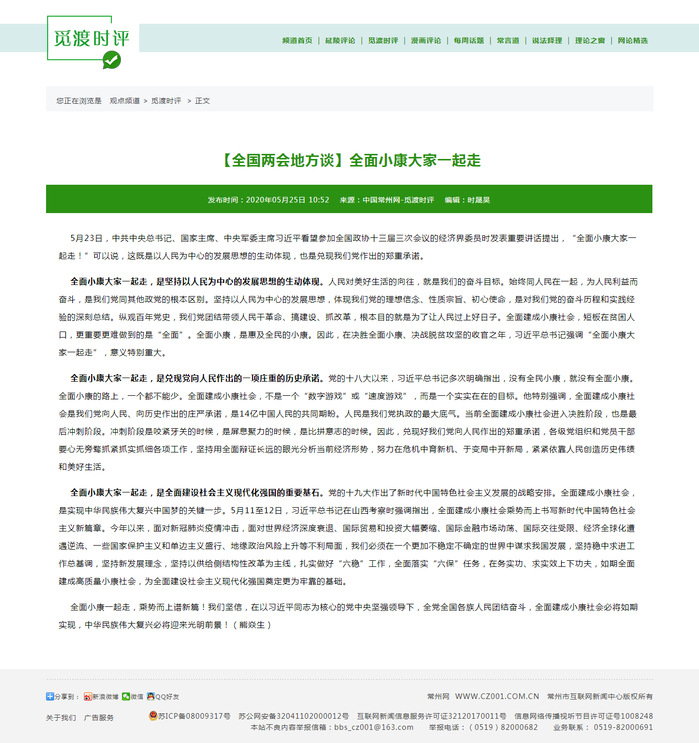 5月25日 中国常州网 | 【全国两会地方谈】全面小康大家一起走
