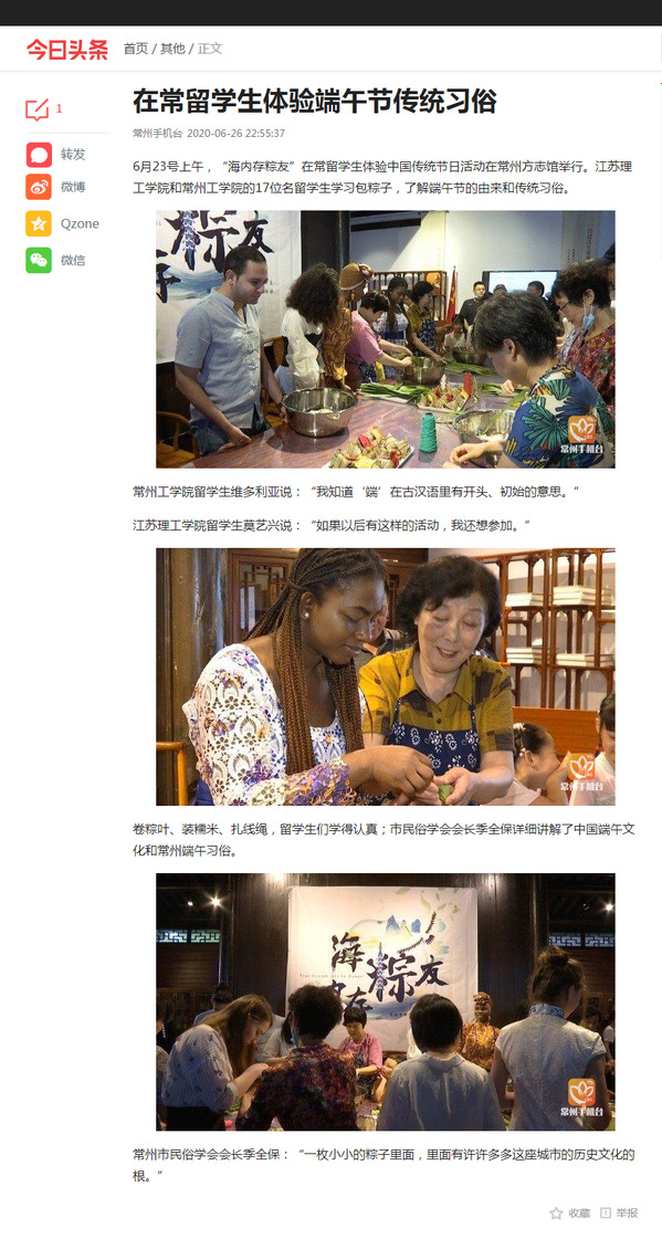 6月23号上午,“海内存粽友”在常留学生体验中国传统节日活动在常州方志馆举行。江苏理工学院和常州工学院的17位名留学生学习包粽子,了解端午节的由来和传统习俗。在常留学生体验端午节传统习俗