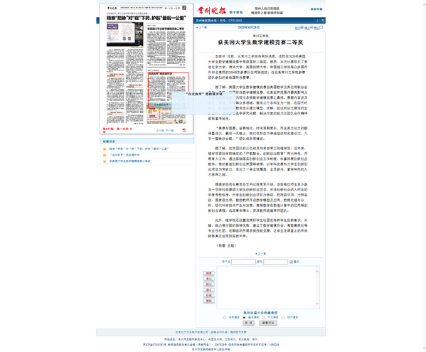 本报讯 日前,从常州工学院传来好消息,该校在2020年美国大学生数学建模竞赛中荣获国际二等奖。据悉,本次比赛吸引了来自北京大学、清华大学、英国剑桥大学、帝国理工学院等众多国内外知名高校的20948支参赛队伍同场竞技。这也是常州工学院参赛团队参加的首场国际性赛事。