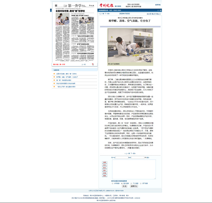 本报讯 记者日前从常州工学院化工与材料学院了解到,该院青年党员教师孙潇楠和许鹏领衔的博士团队,在疫情防控期间,利用业余时间发明了一种可视变色消毒除甲醛剂。