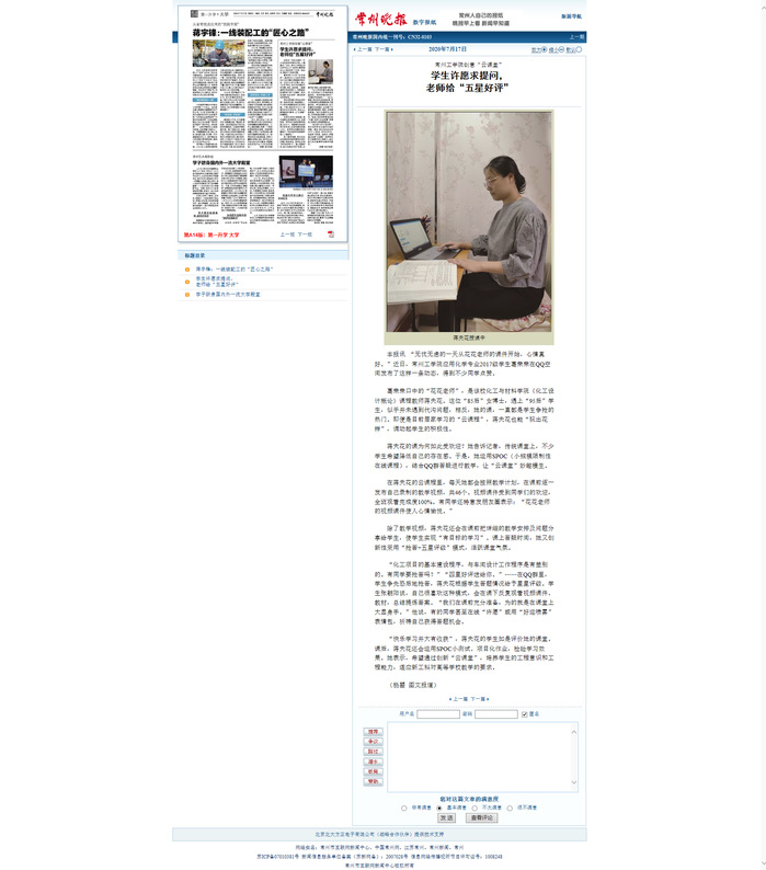 葛荣荣口中的“花花老师”,是该校化工与材料学院《化工设计概论》课程教师蒋夫花。这位“85后”女博士,遇上“95后”学生,似乎并未遇到代沟问题,相反,她的课,一直都是学生争抢的热门。即便是目前居家学习的“云课程”,蒋夫花也能“玩出花样”,调动起学生的积极性。