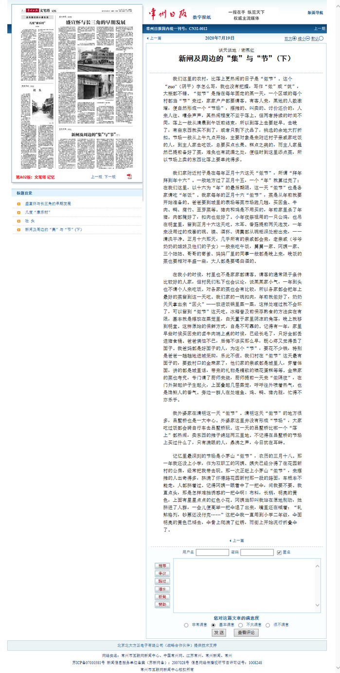 我外婆家在清明这一天“做节”。清明这天“做节”的地方很多,吕墅桥也是一大中心。外婆家这里并没有形成“节场”,大家吃过饭都会骑自行车去吕墅桥玩。这一天的吕墅桥比哪一个“落上”都热闹,卖东西的摊子绵延两三里地。不记得在吕墅桥的节场上买过什么了,只有满眼的人,鼎沸之声,今日犹在耳畔。