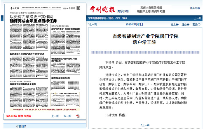 揭牌仪式上,常州工学院与江苏诚功阀门科技有限公司签署校企共建协议。据悉,智能制造产业学院阀门学院将致力于阀门数字研发、数字工艺、数字车间、数字工厂、数字质量及智慧运营的新型管理模式的创新和发展,集聚高校、企业和行业的资源,提升服务地方发展能力,为常州“五大明星城”建设提供重要支撑。同时,为江苏省乃至全国阀门行业智能制造产业一线培养人才,助推阀门制造领域的科技创新、产业升级、资源共享、人才培训和创新资源集聚。