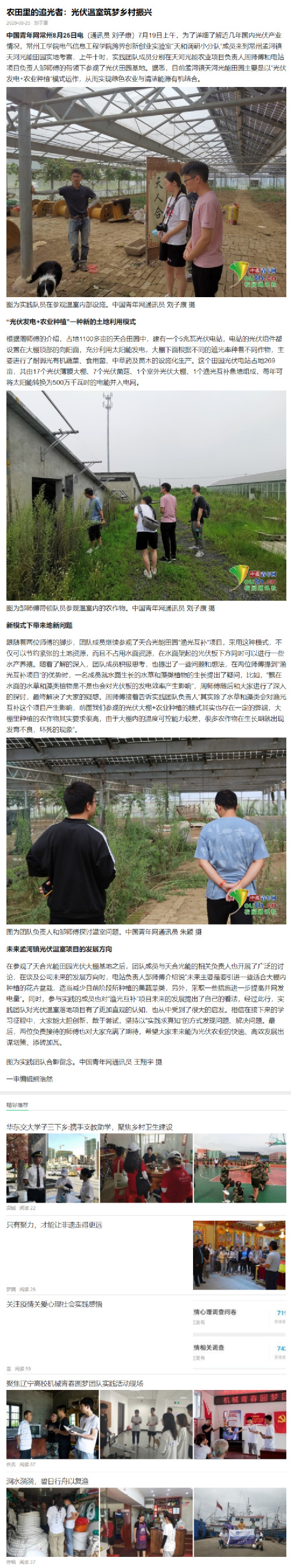 中国青年网常州8月25日电(通讯员 刘子康)7月19日上午,为了详细了解近几年国内光伏产业情况,常州工学院电气信息工程学院跨界创新创业实验室“天和调研小分队”成员来到常州孟河镇天河光能田园实地考察,上午十时,实践团队成员分别在天河光能农业项目负责人周师傅和电站项目负责人邹师傅的带领下参观了光伏田园基地。据悉,目前孟河镇天河光能田园主要是以“光伏发电+农业种植”模式运作,从而实现绿色农业与清洁能源有机结合。为实践队员在参观温室内部设施。中国青年网通讯员 刘子康 摄