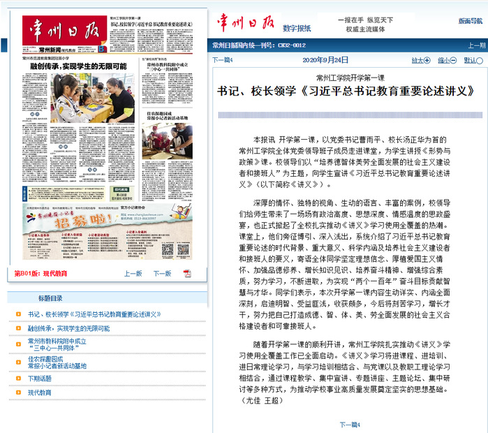 本报讯 开学第一课,以党委书记曹雨平、校长汤正华为首的常州工学院全体党委领导班子成员走进课堂,为学生讲授《形势与政策》课。校领导们以“培养德智体美劳全面发展的社会主义建设者和接班人”为主题,向学生宣讲《习近平总书记教育重要论述讲义》(以下简称《讲义》)。