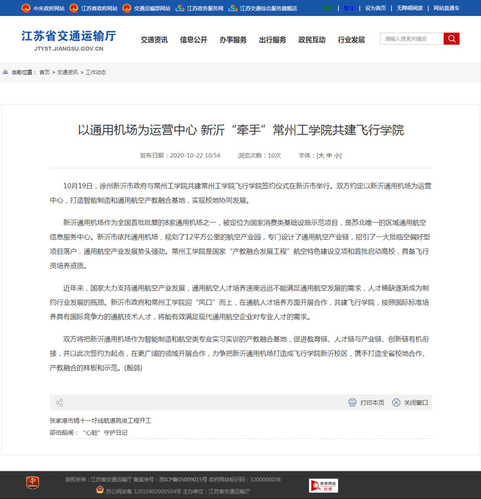 10月19日,徐州新沂市政府与常州工学院共建常州工学院飞行学院签约仪式在新沂市举行。双方约定以新沂通用机场为运营中心,打造智能制造和通用航空产教融合基地,实现校地协同发展。