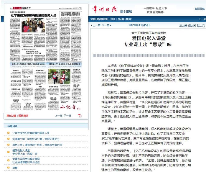 2019年7月,苗雪佩入选江苏省高层次创新创业人才引进计划“科技副总”,今年4月,她获得常州工学院“双师双能型”教师资格。这些宝贵的成绩,也促使苗雪佩在自己的“课程思政”之路上越走越坚定。“《化工机械与设备》的‘课程思政’建设通过案例的设计,重点培养学生遵规守纪的职业素养,强化学生团队合作的意识;培养学生创新、绿色、安全的化工生产理念。同时,展现我国化学工业技术发展等方面的成果,激发学生的文化自信,从而实现专业技术人才的培养目标。” (杨曌)