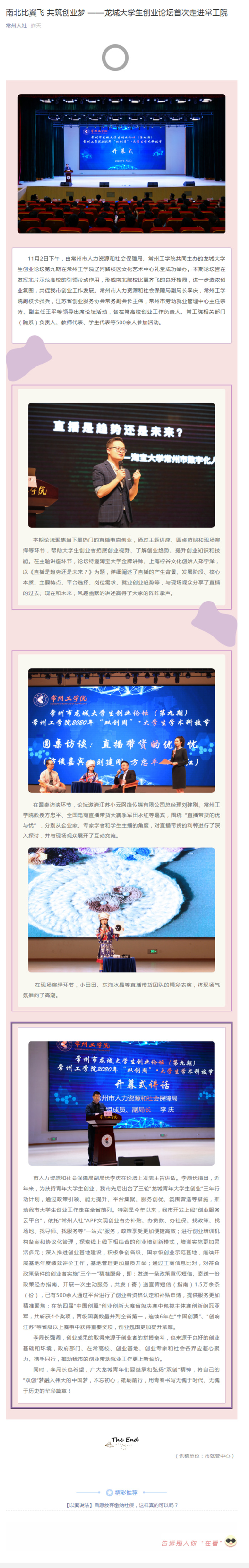 市人力资源和社会保障局副局长李庆在论坛上发表主旨讲话。李局长指出,近年来,为扶持青年大学生创业,我市先后出台了三轮“龙城青年大学生创业”三年行动计划,通过政策引领、能力提升、平台集聚、服务创优、氛围营造等措施,推动我市大学生创业工作走在全省前列。特别是今年以来,我市开发上线“创业服务云平台”,依托“常州人社”APP实现创业者办补贴、办贷款、办社保、找政策、找场地、找导师、找服务等“一站式”服务,政策享受更加便捷高效;进行创业培训机构备案和协议化管理,探索线上线下相结合的创业培训新模式,培训实施更加灵活多元;深入推进创业基地建设,积极争创省级、国家级创业示范基地,继续开展基地年度绩效评价工作,基地管理更加量质并举;通过工商信息比对,对符合政策条件的创业者实施“三个一”精准服务,即:发送一条政策宣传短信、寄送一份政策经办指南、开展一次主动服务,共发(寄)送宣传短信(指南)1.5万余条(份),已有500余人通过平台进行了创业者资格认定和补贴申请,提供服务更加精准聚焦;在第四届“中国创翼”创业创新大赛省级决赛中包揽主体赛创新组冠亚军,共斩获4个奖项,晋级国赛数量并列全省第一,连续6年在“中国创翼”、“创响江苏”等省级以上赛事中获得重要奖项,创业氛围更加提升浓厚。