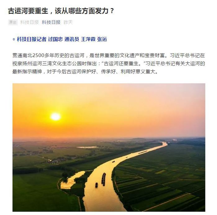 贯通南北2500多年历史的古运河,是世界重要的文化遗产和宝贵财富。习近平总书记在视察扬州运河三湾文化生态公园时指出:“古运河还要重生。”习近平总书记有关大运河的最新指示精神,对于今后古运河保护好、传承好、利用好意义重大。