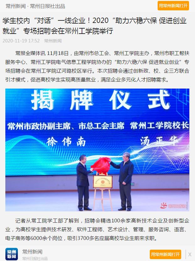 常报全媒体讯 11月18日,由常州市总工会、常州工学院主办,常州市职工帮扶服务中心、常州工学院电气信息工程学院协办的“助力六稳六保 促进就业创业”专场招聘会在常州工学院辽河路校区举行。本次招聘会通过创新政、校、企三方联合引才模式,促进高校学生实现高质量就业,满足企业多元化人才招聘需求。