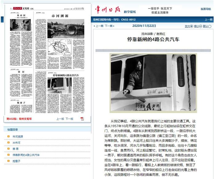 从我记事起,4路公共汽车就是我们上城的主要交通工具。这条从1957年10月开通的公交线路,最初上行起始站设在虹桥文在门,终点为新闸镇。4路车从新闸到西新桥这一段,一路沿京杭大运河、关河向东,这条路为镇澄公路(镇江至江阴)的一段,命名为常新路。那时候,大运河上船只往来大多满载沙子、煤炭、棉花等等,吃水很深,河水几乎贴着舱沿,而且多拖船,往往十几艘船连成一线,鱼贯而行。河上船运繁忙,时常轧档,这时船头便出现一男子,朝对面逶迤而来的船队挥手呼喊。有时这个角色也由女人担当,女性的高分贝音量常引起岸上行人注目,忍不住驻足观看。坐在4路车上,看一路船行,看船上人家烧饭的缕缕炊烟、鼓足了风呼啦啦飘着的晾晒衣物、在窄窄的船沿上行走自如的光着上身的小孩,这段路程对一个悠闲的乘客而言,倒不无乐趣。