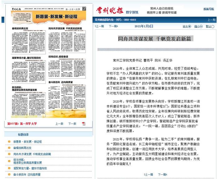 2021年,学校将弘扬“勇争一流,耻为二手”的常州精神,服务“国际化智造名城、长三角中轴枢纽”城市定位,聚焦产教融合和创新创业教育,创建一流应用技术大学,培养高素质应用型人才,为产业赋能,主动服务五大明星城建设和常州经济社会发展,推动学校事业高质量发展,回馈全市社会各界的厚爱与期待,为党的百年华诞献礼!