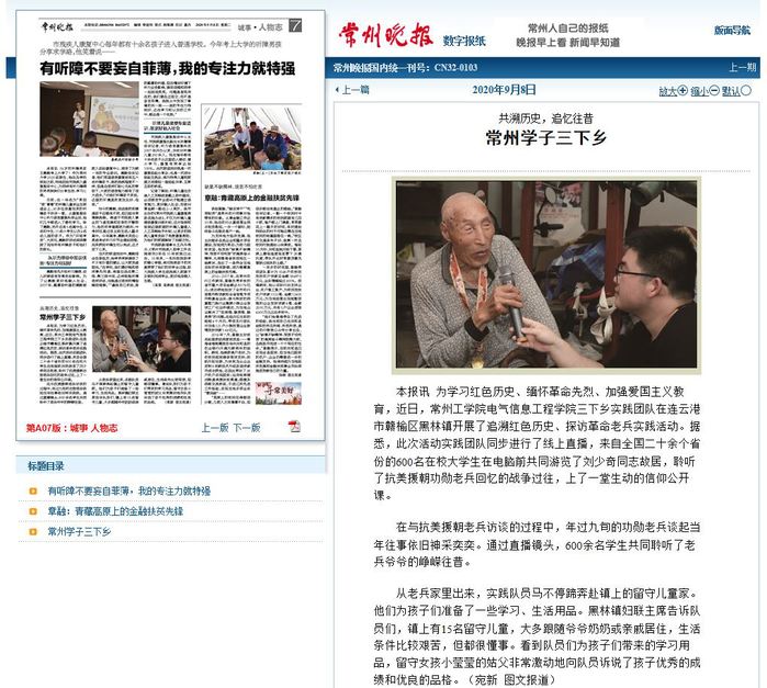 本报讯 为学习红色历史、缅怀革命先烈、加强爱国主义教育,近日,常州工学院电气信息工程学院三下乡实践团队在连云港市赣榆区黑林镇开展了追溯红色历史、探访革命老兵实践活动。据悉,此次活动实践团队同步进行了线上直播,来自全国二十余个省份的600名在校大学生在电脑前共同游览了刘少奇同志故居,聆听了抗美援朝功勋老兵回忆的战争过往,上了一堂生动的信仰公开课。