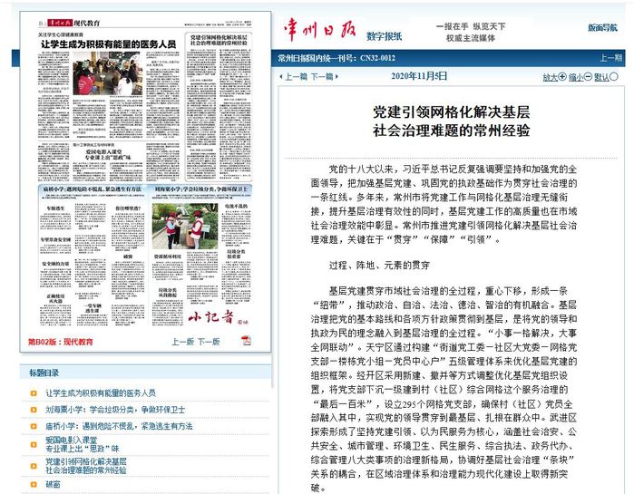 党建引领社会治理,党组织体系的覆盖式嵌入既保证了各项工作方向的正确性,也形成服务群众的“加油站”。近年来,常州在全市高标准建设“龙城先锋”阵地群,扎实推进市、辖市(区)、镇(街道)、村(社区)四级党群服务中心建设,建设了一批引领基层社会治理的党建示范基地。常州市委提出乡村振兴“1+8+3”的工作框架体系,其中重要的一项就是实施党建引领乡村振兴五大行动,实现“组织提质”“三支队伍”“党群服务”“先锋阵地”和“党建元素”的全面引领,形成“上面千条线,下面一张网”的新局面。在2020年疫情防控中,常州市充分发挥党建引领网格化基层治理优势,突出“全、细、专、精”工作要求,党组织书记带头领衔,采取“网格员+网格家庭医生+网格民警+网格城管+小区物业+楼道长”的“六合一”模式开展分片包干式防控,开展 “地毯式”排查和“立体式”宣传,切实把党的组织优势转化为打赢疫情防控攻坚战的工作优势。溧阳市为了让社区群众“有话跟我说,有事找我办,有难找我帮”,社区将网格长、网格管理员的联系方式、包干区域等信息制作成“民情联系卡”,发放到每家每户,为居民提供高效服务。