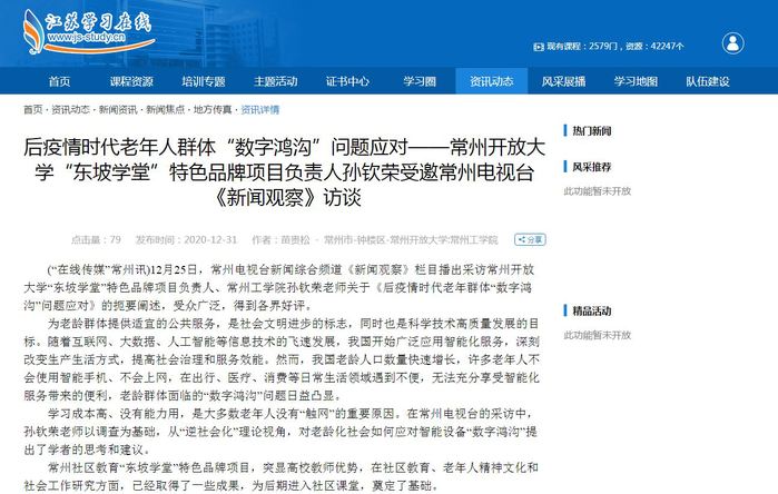 (“在线传媒”常州讯)12月25日,常州电视台新闻综合频道《新闻观察》栏目播出采访常州开放大学“东坡学堂”特色品牌项目负责人、常州工学院孙钦荣老师关于《后疫情时代老年群体“数字鸿沟”问题应对》的扼要阐述,受众广泛,得到各界好评。