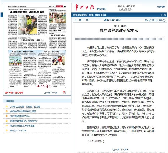 本报讯 1月11日,常州工学院“课程思政研究中心”正式揭牌成立。常州工学院各二级学院、相关职能部门负责人等29人受聘为课程思政研究中心成员。