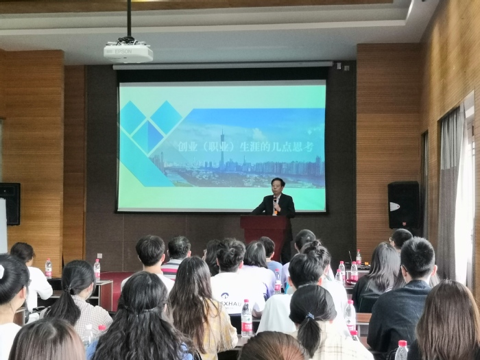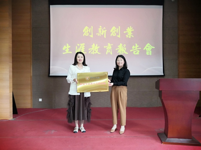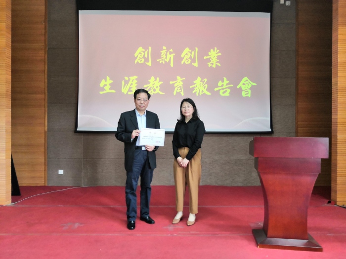 张巧凤为我校知名校友、中华孝道园股份有限公司董事长蒋建名颁发聘书,举行常州工学院大学生生涯教育基地授牌仪式。随后,董事长蒋建名结合常州改革史、中华孝道园成长史和自己职业生涯的诸多感悟,从学校学业与社会创业的区别、三观的齐、正、合和如何找到自己未来的蓝海行业三个方面展开充分剖析,勉励每位同学都找到适合自己的职业,拥有美好的精彩人生,精彩的报告赢得阵阵掌声。
