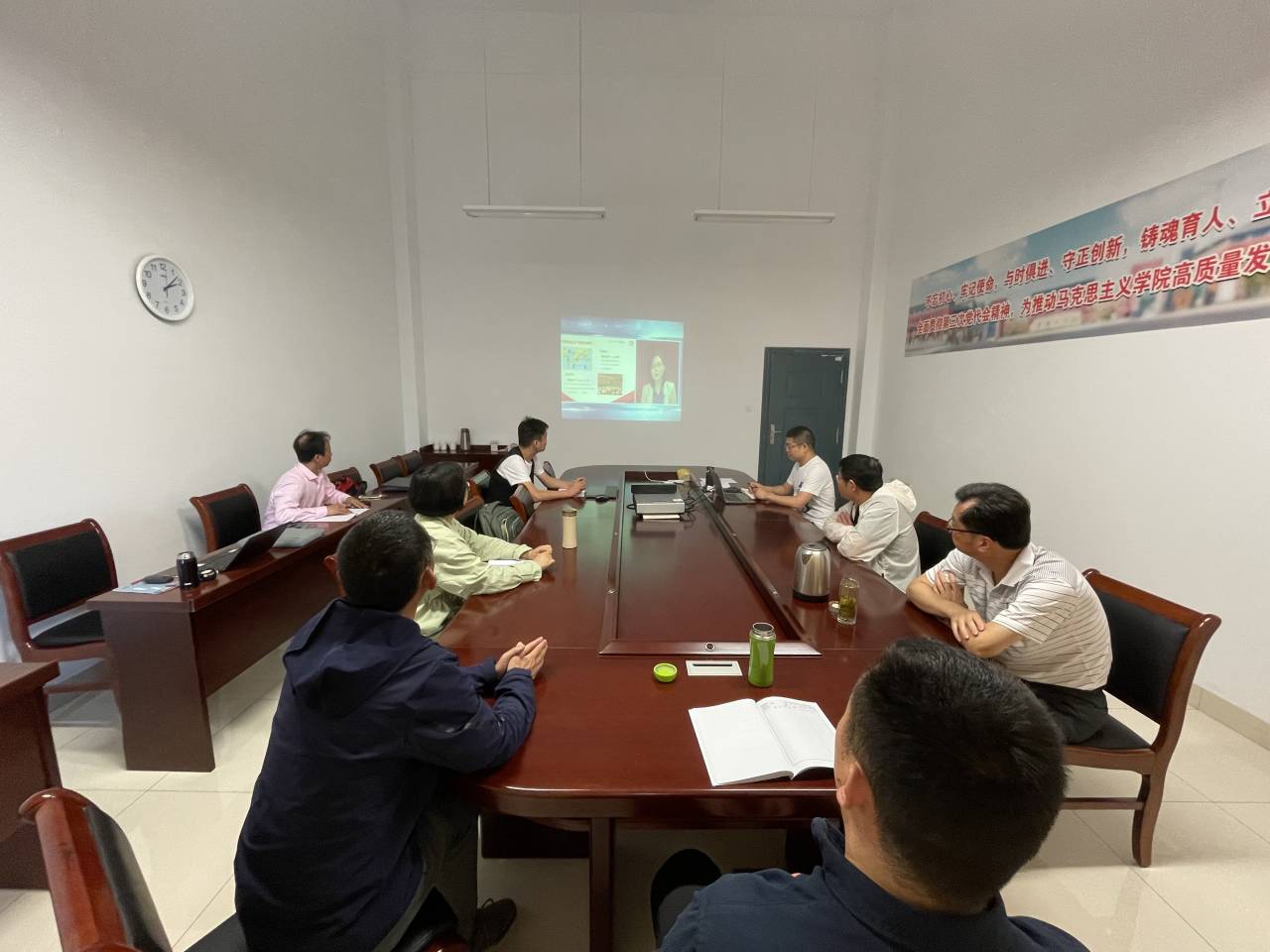 5月22日下午,马克思主义学院组织《马克思主义基本原理概论》课程组思政课教师在瑶光楼集中观看学习“四史”讲堂第四讲“同上社会主义发展史思政大课”。学院其他教师在线进行观看学习。