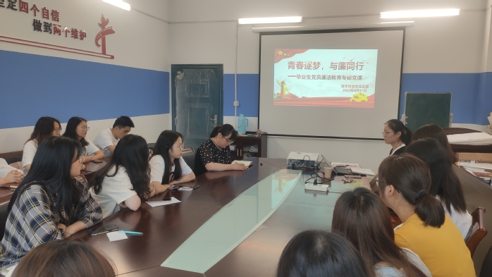 “青春逐梦,与廉同行”主题教育中,毕业生党员一同观看反腐倡廉专题片《永远在路上》,影片彰显了中央反腐的决心和意志。党总支副书记郦江妍给毕业生党员进行廉洁教育,要求毕业生党员要做到以案为鉴,筑牢防线,防微杜渐,坚定理想信念,永葆共产党人本色。