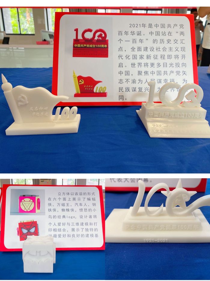 参赛同学设计的系列模型和展品,受到广泛关注和一致好评,这是航飞学子致敬建党百年的诚挚献礼。一等奖的摆台《党旗飘扬》,设计者融入了“100周年”和党旗的元素,进行文字设计、模型美化,把传统元素和新兴技术很好的结合在一起,展现了灵活的创意。获得二等奖的空客A220飞机模型向全校师生展示了工科学子的专业性和较强的动手能力,也体现了百年华诞之际,站在“两个一百年”奋斗目标交汇时间点的青年大学生们对于实现中国梦的美好祝愿。
