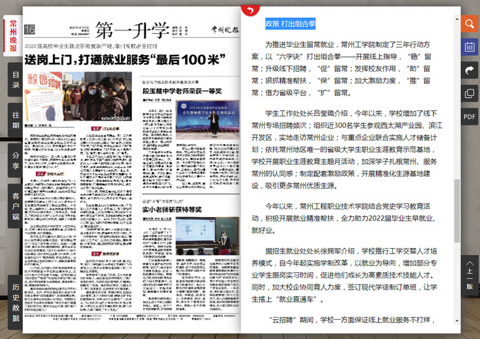 学生工作处处长吕莹璐介绍,今年以来,学校增加了线下常州专场招聘频次;组织近300名学生参观西太湖产业园、滨江开发区,实地走访常州企业;与重点企业联合实施人才储备计划;依托常州地区唯一的省级大学生职业生涯教育示范基地,学校开展职业生涯教育主题月活动,加深学子扎根常州、服务常州的认同感;制定配套激励政策,开展精准化生源基地建设,吸引更多常州优质生源。
