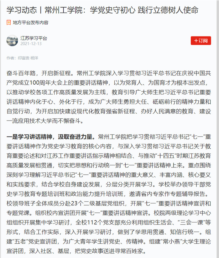奋斗百年路,开启新征程。常州工学院深入学习贯彻习近平总书记在庆祝中国共产党成立100周年大会上的重要讲话精神,以为党育人、为国育才为根本出发点,以推动学校各项工作高质量发展为主线,教育引导广大师生把习近平总书记重要讲话精神内化于心、外化于行,成为广大师生勇担大任、砥砺前行的精神力量和自觉行动,为开启加快建设现代化教育强省新征程、办好人民满意的教育、建设一流应用技术大学而不懈奋斗。