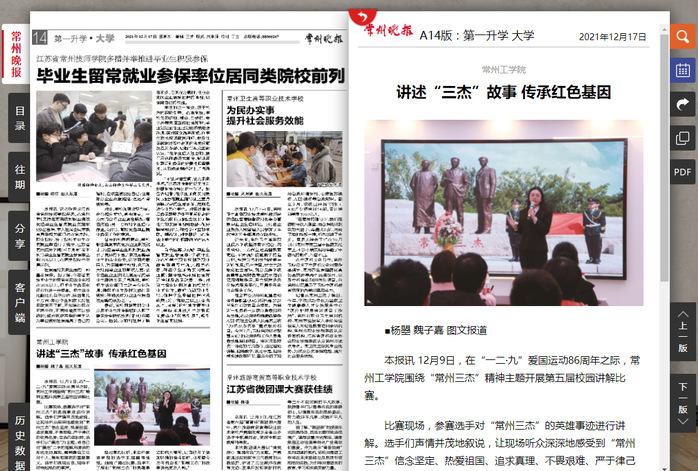 经过激烈比拼,来自外国语学院的选手王越摘得桂冠。她说:“通过比赛,我学习了解到‘常州三杰’的英雄事迹和伟大精神,让自己有了更加明确的奋斗目标,也希望今后有机会把‘常州三杰’的故事讲给更多人听。”