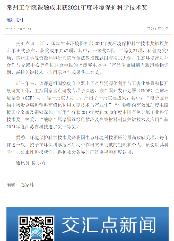 交汇点讯 近日,国家生态环境保护部2021年度环境保护科学技术奖拟授奖名单正式公布。获奖成果共47项。其中,一等奖7项,二等奖37项,科普类奖3项。常州工学院资源环境研究院周全法教授课题组与南京大学、生态环境部对外合作与交流中心等单位联合申报的“废弃电器电子产品生命周期内新污染物识别、减控关键技术与应用示范”成果获二等奖。