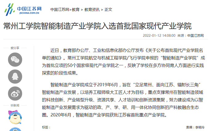 近日,教育部办公厅、工业和信息化部办公厅发布《关于公布首批现代产业学院名单的通知》。常州工学院航空与机械工程学院/飞行学院申报的“智能制造产业学院”成为首批立项的50个国家级现代产业学院之一,反映了学校在多方协同育人方面进行实践探索的阶段性成果。