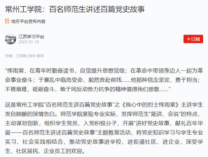 这是常州工学院“百名师范生讲百篇党史故事”之《我心中的烈士恽雨棠》主讲学生发自肺腑的深情告白。师范学院紧贴专业实际,发挥师范生“能讲、会说”的特点,主动谋划创新,组织学生党员、入党积极分子,开展“讲好党史故事,献礼百年华诞——百名师范生讲述百篇党史故事”主题教育活动,将党史知识学习与学生专业实习、社会实践相结合,推动党史故事进学校、进街道社区、进企业,深受学生、社区居民、企业员工的欢迎。
