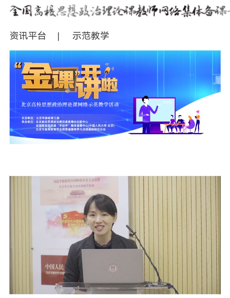 示范教学由4位教学名师主讲,他们围绕学习贯彻党的十九届六中全会精神、迎接宣传贯彻党的二十大和解读2021版新教材重点难点进行了示范教学,分别是中央财经大学马克思主义学院副教授文雅讲授“为什么‘躺平’的人生不值得过”(教材第一章第二节);中国人民公安大学马克思主义学院副教授白洁讲授“感悟精神的力量——以伟大建党精神为源头的精神谱系”(教材第三章第一节);北京化工大学马克思主义学院教授于文博讲授“坚持‘两个结合’ 传承中华传统美德”(教材第五章第二节);北京大学马克思主义学院副教授张会峰讲授“全面依法治国的根本遵循——习近平法治思想”(教材第六章第二节)。