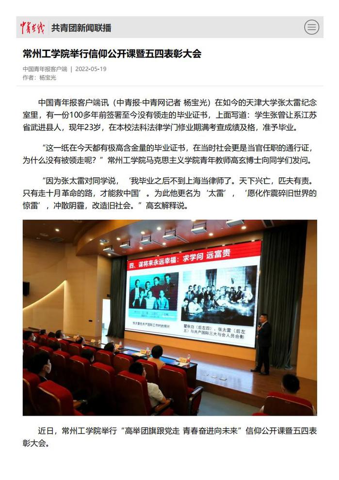 近日,常州工学院举行“高举团旗跟党走 青春奋进向未来”信仰公开课暨五四表彰大会。