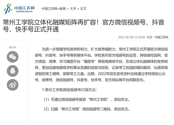 为进一步增强学校宣传影响力,扩大宣传辐射力,常州工学院正式开通官方微信视频号、抖音号、快手号等新媒体平台。学校系列官方视频号的运营,将链接校园网、官方微信、微博、学习强国平台“强国号”等现有媒体平台,形成立体化融媒体的宣传矩阵,更加迅捷地展现学校事业发展的成就与经验、记录常工校园的精彩瞬间、弘扬昂扬进取的常工精神、凝聚常工力量。近期,2022年招生宣传资料也将通过学校微信公众号、微博号、微信视频号、抖音号、快手号、官方网站等平台同期发布。