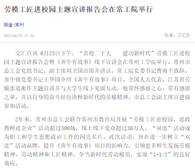 “喜迎二十大 建功新时代”劳模工匠进校园主题宣讲报告会暨《奔牛有故事》线下宣讲会在常州工学院举行。常州市总工会党组书记、副主席刘卫国出席并讲话,常工院党委书记曹雨平致辞。奔牛镇党委书记王华国介绍《奔牛有故事》项目。全国人大代表、江苏省劳模张道衡作主题宣讲并与大学生线下见面互动,他常怀感恩之心,常有感恩之举,并以自身的奋斗经历诠释新时代的劳模精神。市总工会副主席宣建强参加活动。