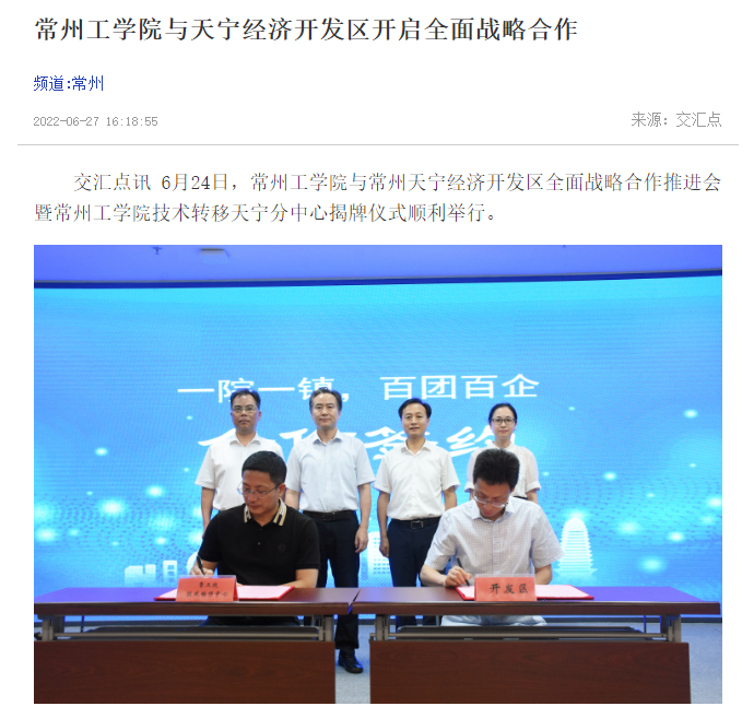 交汇点讯 6月24日,常州工学院与常州天宁经济开发区全面战略合作推进会暨常州工学院技术转移天宁分中心揭牌仪式顺利举行。