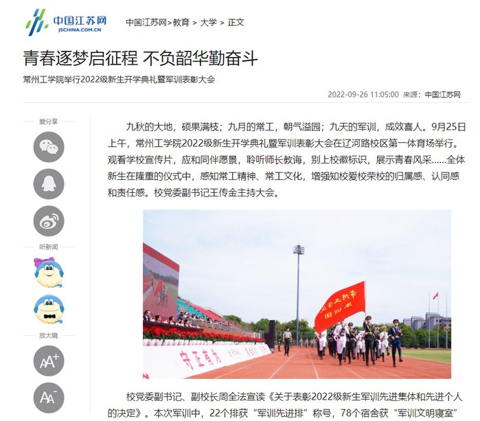 九秋的大地,硕果满枝;九月的常工,朝气溢园;九天的军训,成效喜人。9月25日上午,常州工学院2022级新生开学典礼暨军训表彰大会在辽河路校区第一体育场举行。观看学校宣传片,应和同伴愿景,聆听师长教诲,别上校徽标识,展示青春风采……全体新生在隆重的仪式中,感知常工精神、常工文化,增强知校爱校荣校的归属感、认同感和责任感。校党委副书记王传金主持大会。