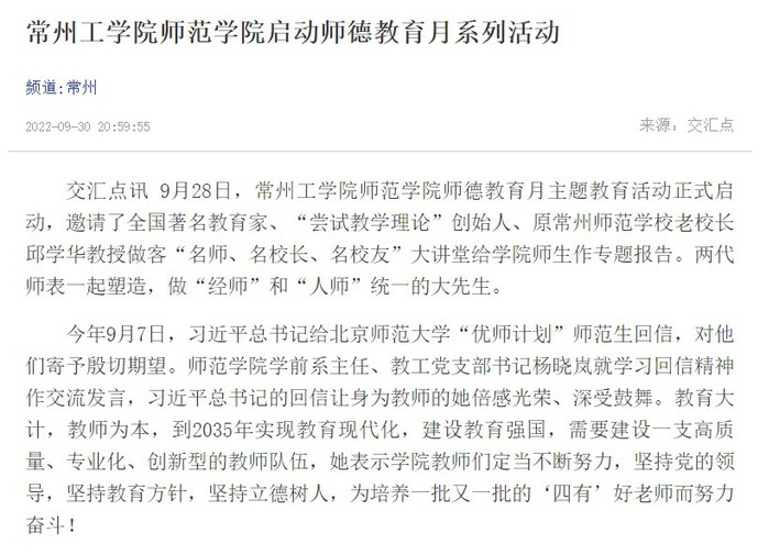 交汇点讯 9月28日,常州工学院师范学院师德教育月主题教育活动正式启动,邀请了全国著名教育家、“尝试教学理论”创始人、原常州师范学校老校长邱学华教授做客“名师、名校长、名校友”大讲堂给学院师生作专题报告。两代师表一起塑造,做“经师”和“人师”统一的大先生。