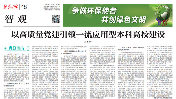 百年大计,教育为先。党的二十大报告提出,教育、科技、人才是全面建设社会主义现代化国家的基础性、战略性支撑。必须坚持科技是第一生产力、人才是第一资源、创新是第一动力,深入实施科教兴国战略、人才强国战略、创新驱动发展战略,开辟发展新领域新赛道,不断塑造发展新动能新优势。应用型本科高校已成为科教兴国不可或缺的重要力量。作为一所地方应用型本科高校,常州工学院始终坚持以习近平新时代中国特色社会主义思想为指导,坚持把党的领导落实到办学治校全过程,坚持扎根地方办大学,走出一条党建引领高质量发展的办学之路。
