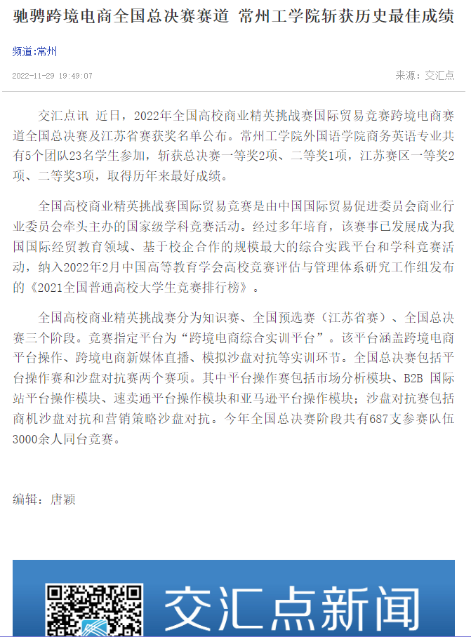 交汇点讯 近日,2022年全国高校商业精英挑战赛国际贸易竞赛跨境电商赛道全国总决赛及江苏省赛获奖名单公布。常州工学院外国语学院商务英语专业共有5个团队23名学生参加,斩获总决赛一等奖2项、二等奖1项,江苏赛区一等奖2项、二等奖3项,取得历年来最好成绩。