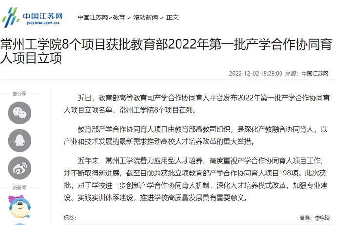 近日,教育部高等教育司产学合作协同育人平台发布2022年第一批产学合作协同育人项目立项名单,常州工学院8个项目在列。