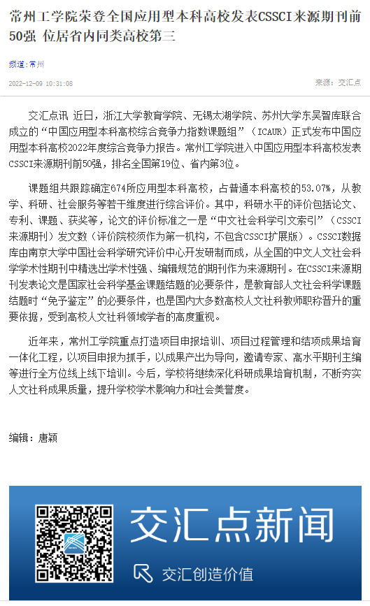 交汇点讯 近日,浙江大学教育学院、无锡太湖学院、苏州大学东吴智库联合成立的“中国应用型本科高校综合竞争力指数课题组”(ICAUR)正式发布中国应用型本科高校2022年度综合竞争力报告。常州工学院进入中国应用型本科高校发表CSSCI来源期刊前50强,排名全国第19位、省内第3位。