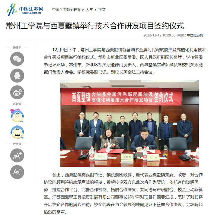 12月9日下午,常州工学院与西夏墅镇就含油多金属污泥深度脱油及高值化利用技术合作研发项目举行签约仪式。常州市新北区委常委、区人民政府副区长樊烨,学校党委书记汤正华,常州市、新北区相关职能部门负责人,西夏墅镇党政领导及学校相关职能部门负责人参会。学校党委副书记、副校长周全法主持会议。