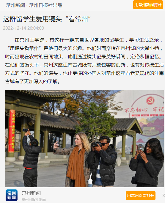 在常州工学院,有这样一群来自世界各地的留学生,学习生活之余,“用镜头看常州”是他们最大的兴趣。他们时而穿梭在常州城的大街小巷,时而出现在农村的田间地头,他们通过镜头记录美好瞬间,定格永恒记忆。在他们的镜头下,常州这座江南古城既有开放包容的创新,也有对传统生活方式的坚守。他们的镜头,也让更多的外国人对常州这座古老又现代的江南古城有了更加深入的了解。