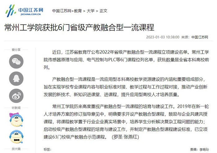 近日,江苏省教育厅公布2022年省级产教融合型一流课程立项建设名单。常州工学院传感器原理与应用、电气控制与PLC等6门课程位列名单,获批数量居全省本科高校前列。