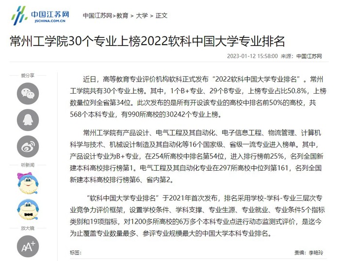 近日,高等教育专业评价机构软科正式发布“2022软科中国大学专业排名”。常州工学院共有30个专业上榜。其中,1个B+专业、29个B专业,上榜专业占比50.8%,上榜数量位列全省第34位。此次发布的是所有开设该专业的高校中排名前50%的高校,共568个本科专业,有990所高校的30242个专业上榜。
