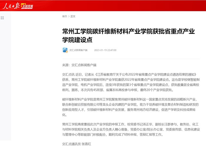 交汇点讯 近日,记者从《江苏省教育厅关于公布2022年省级重点产业学院建设点遴选结果的通知》获悉,常州工学院碳纤维新材料产业学院喜获2022年省级重点产业学院建设点。这也是学校继智能制造产业学院、电机产业学院后,连续3年获批的第3个省级重点产业学院建设点,获批数量居全省高校前列。据悉,本次共有45所部、省属本科高校参与申报,最终20个产业学院获批。