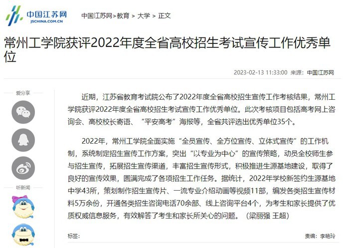 近期,江苏省教育考试院公布了2022年度全省高校招生宣传工作考核结果,常州工学院获评2022年度全省高校招生考试宣传工作优秀单位。此次考核项目包括高考网上咨询会、高校校长寄语、“平安高考”海报等,全省共评选出优秀单位35个。